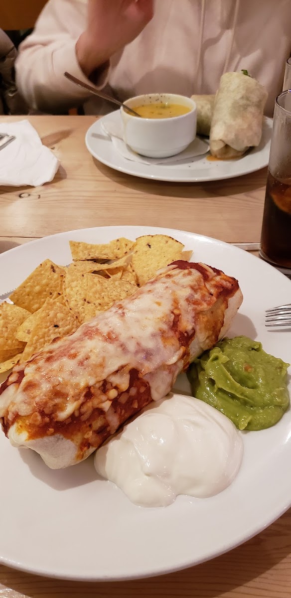 - Chicken Burrito: A hearty wrap filled with Spanish rice, adobo chicken, corn, and black beans, topped with zesty guajillo sauce. It’s paired perfectly with sour cream and crunchy corn tortilla chips for only CA$20.00.